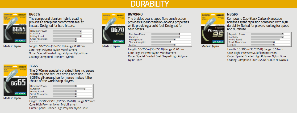 Different strings have different characteristics. Thicker strings usually offer greater durability while thinner strings generally offer better control, but less durability. Thinner strings may offer greater power, provided the player can hit the shuttle in the sweet spot on the racquet. Failing to hit the sweet spot will result in more string breakage.